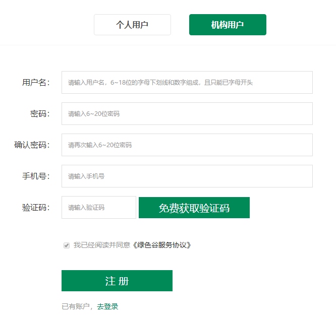 1、登录绿色谷( www.520green.com), 点击右上角【免费注册】。